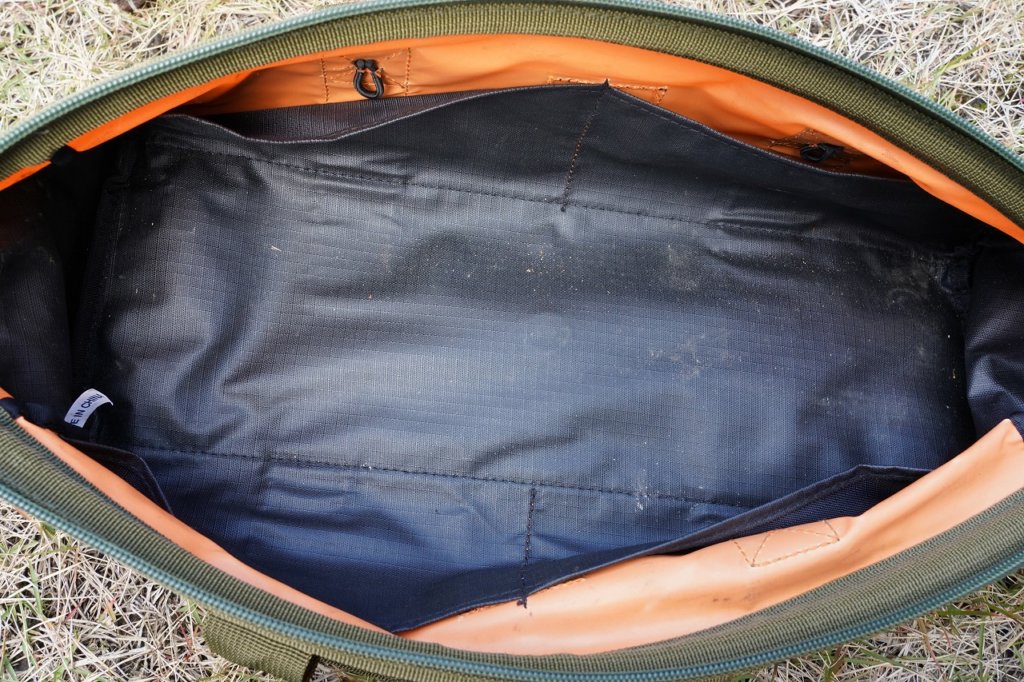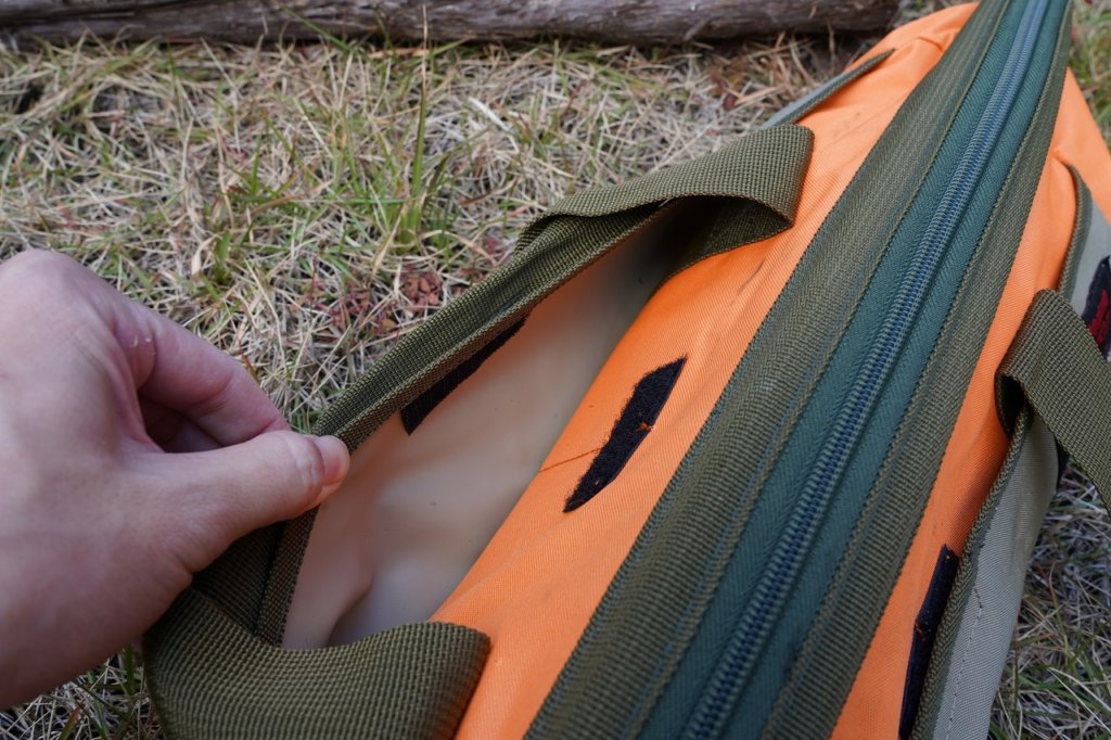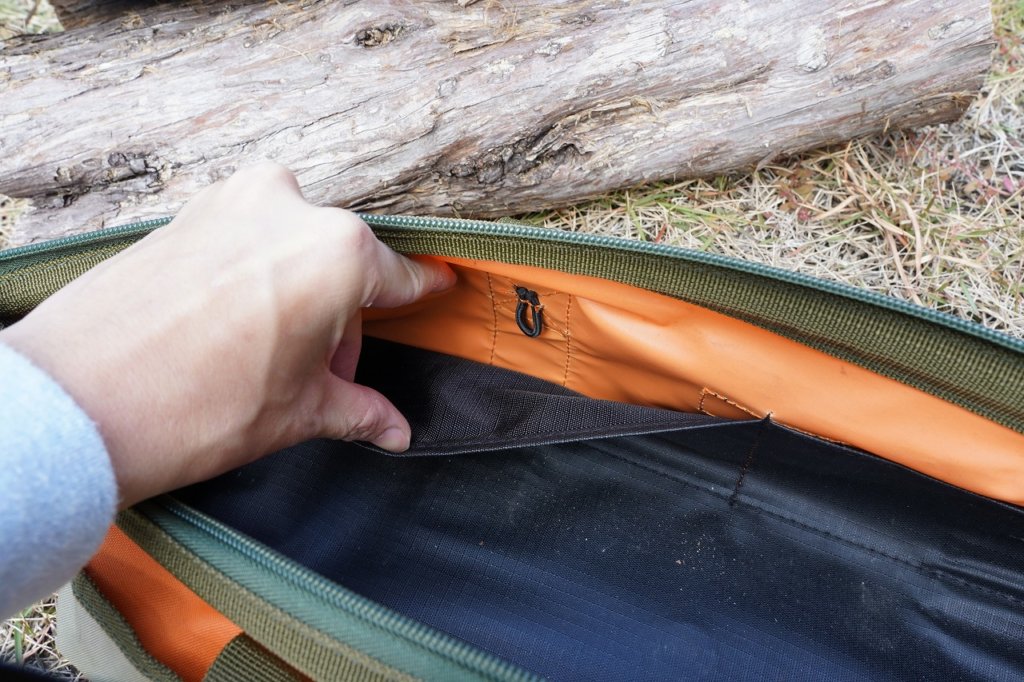 メイン収納の両サイドにはマジックテープ付きのサイドポケットを装備。あまり嵩張るようなモノは収納できません、予備のガイロープなどちょっとしたモノを入れておくのが良いと思います。