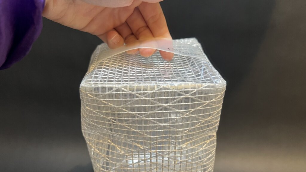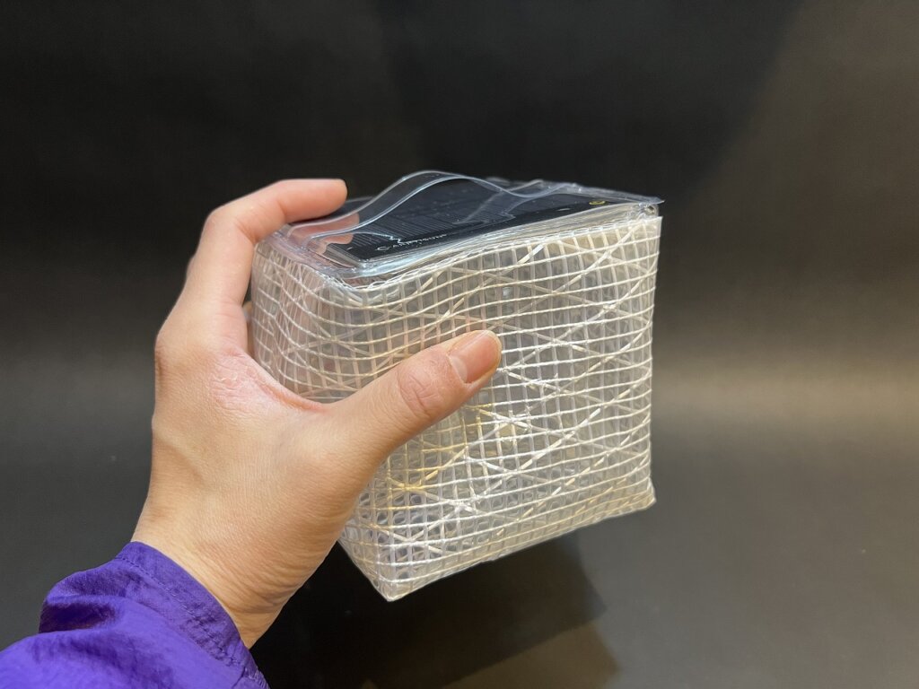 使うときは上下のハンドルを持って引っ張るときれいな立方体になります。手を放しても崩れることはありません。