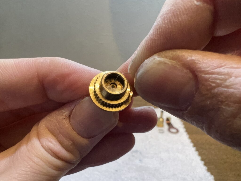 ガス器具清掃用の針をノズルチップに刺してガスのお通じを良くしてやりましょう。