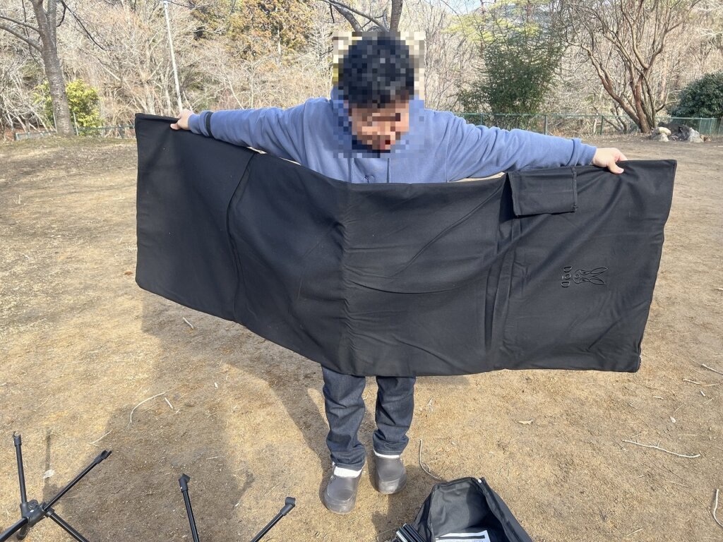撤収作業でキャリーバッグに入れるためベッドマットを丸めていかなければなりません。そのとき土で汚れたりしないようにグランドシートなどを用意しておいて、その上で丸める手間が必要かと感じました。